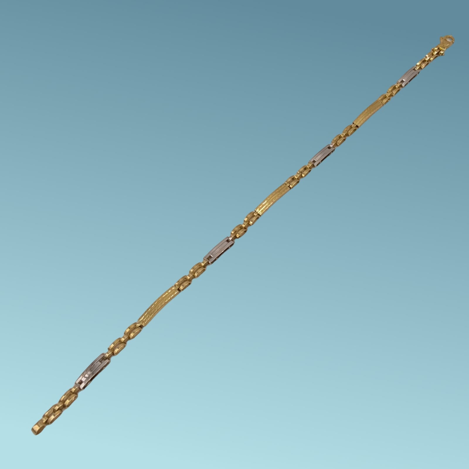 Bracciale i oro 18kt con piastre in oro giallo con lavorazione zigrinata alternate a piastre in oro bianco finitura liscia unite da due maglie aperte, chiusura con moschettone, lunghezza 21cm.