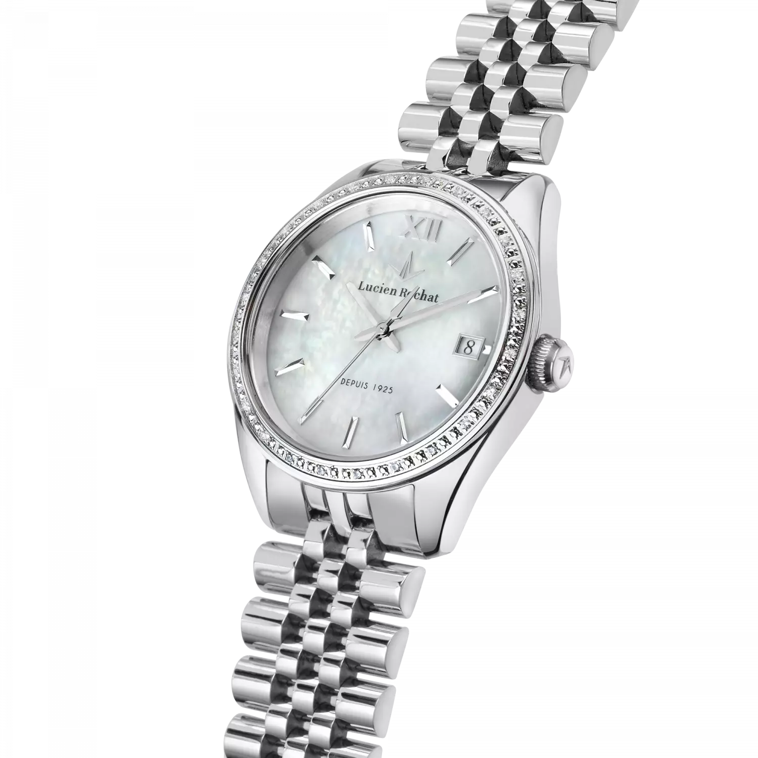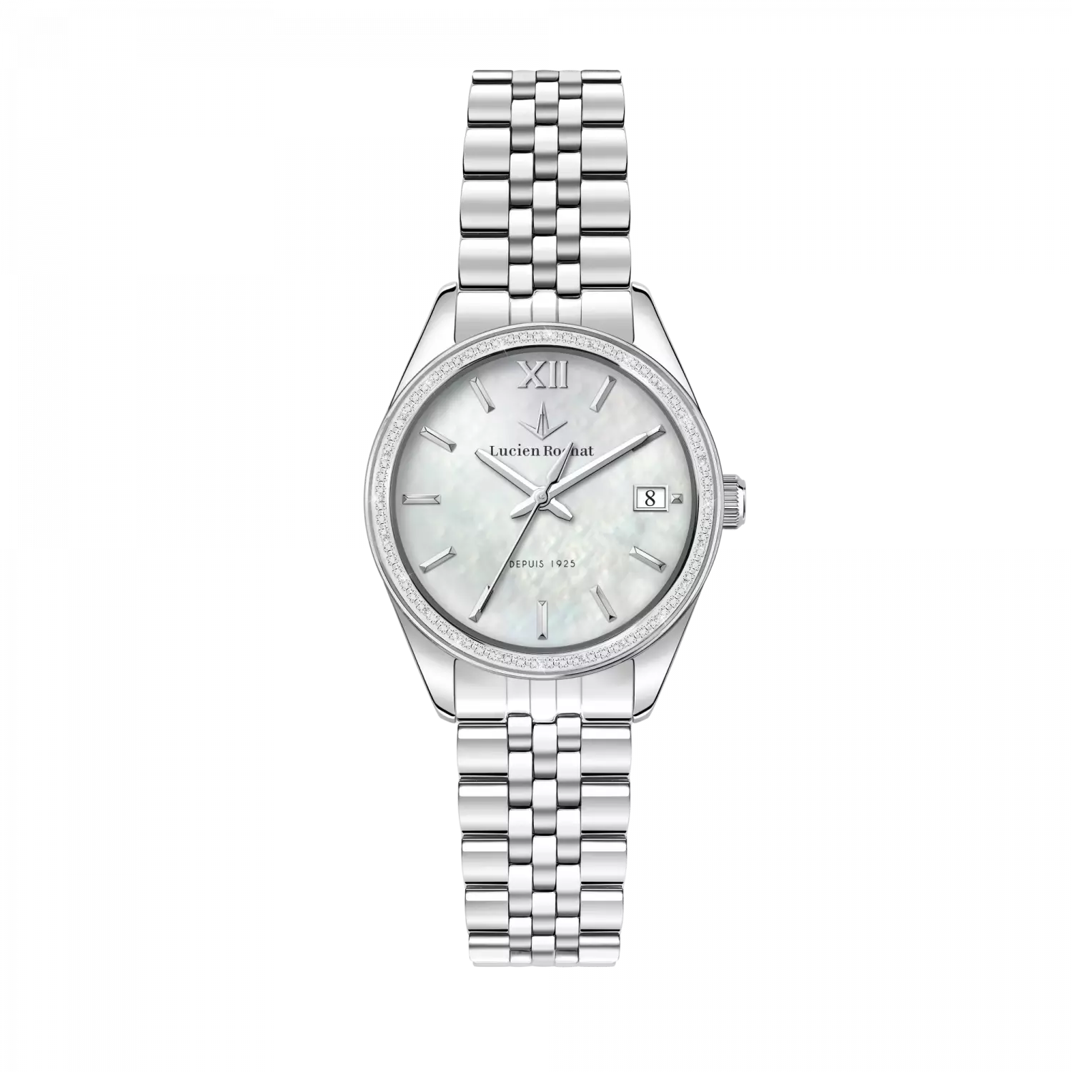 Orologio Lucien Rochat Donna Collezione Madame, movimento al quarzo con funzione di solo tempo con data. La cassa è in acciaio inox da 31mm con diamanti naturali H/SI incassati sulla lunetta, fondello a vite e vetro zaffiro. Il quadrante madreperla presenta indici e lancette in acciaio . Bracciale in acciaio inox con chiusura deployante, resistente all’acqua fino a 30 metri di profondità.