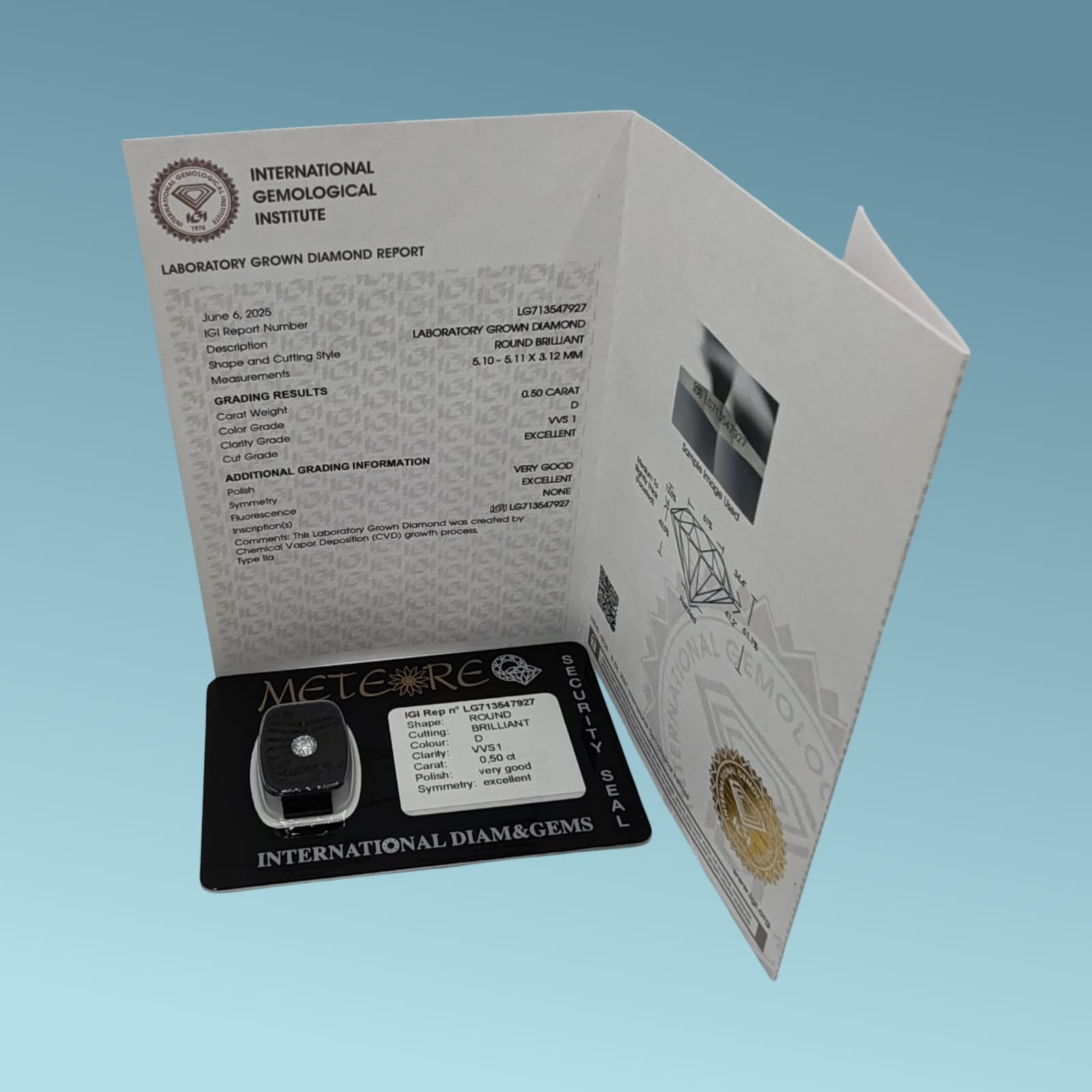 Diamante creato in Laboratorio 0.50 carato D color VVS1 Certificato IGI report n° LG713547927 Taglio Excellent, Finitura Very good, Simmetria Excellent. Blisterato da Meteore Gioielli
